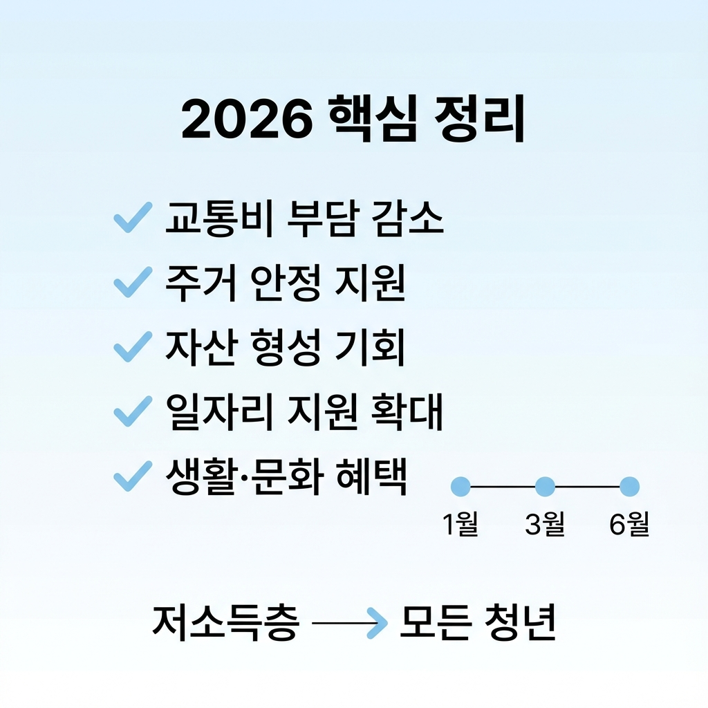 2026년, 대한민국 청년을 위한 보편적 복지 정책이 시작됩니다! SBS 뉴스에서 발표한 역대급 청년 지원 정책을 한눈에 정리했습니다. 교통비, 주거, 일자리, 자산 형성까지 전방위적으로 확대된 혜택을 지금 바로 확인하세요!
