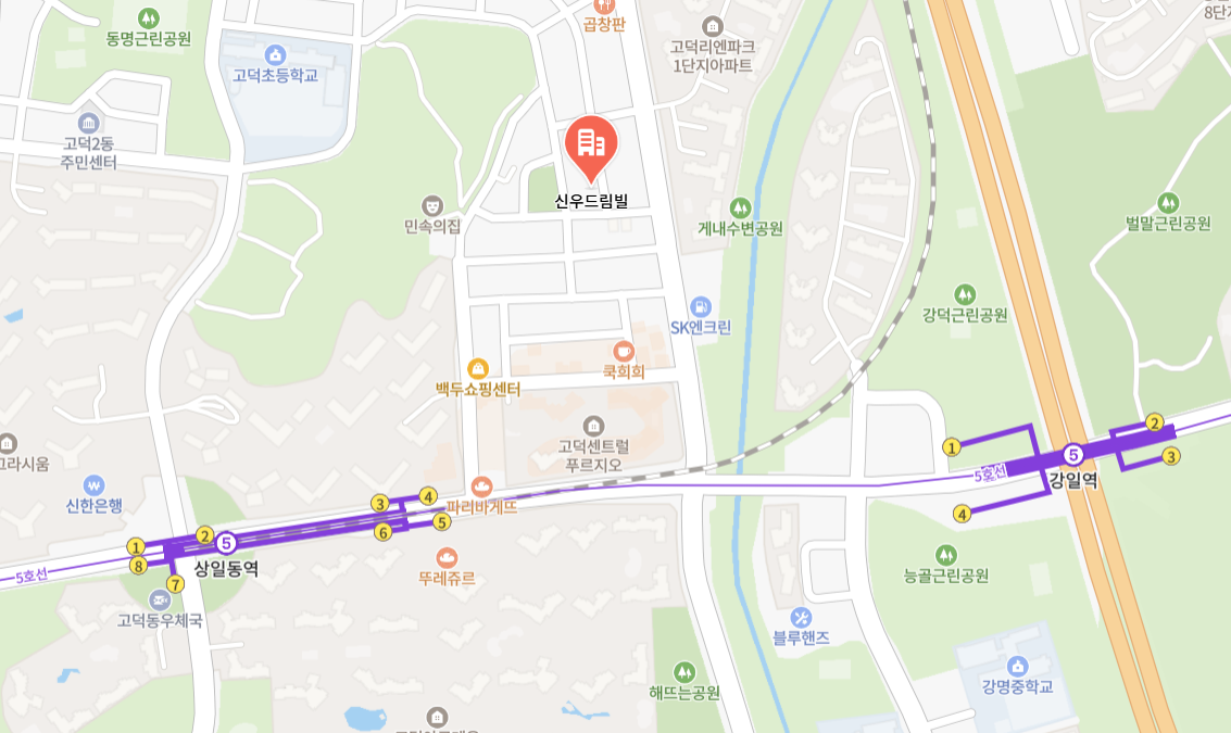 - 상일동역과 강일역 사이에 위치한 주택으로, 각각 도보 7분, 11분입니다.